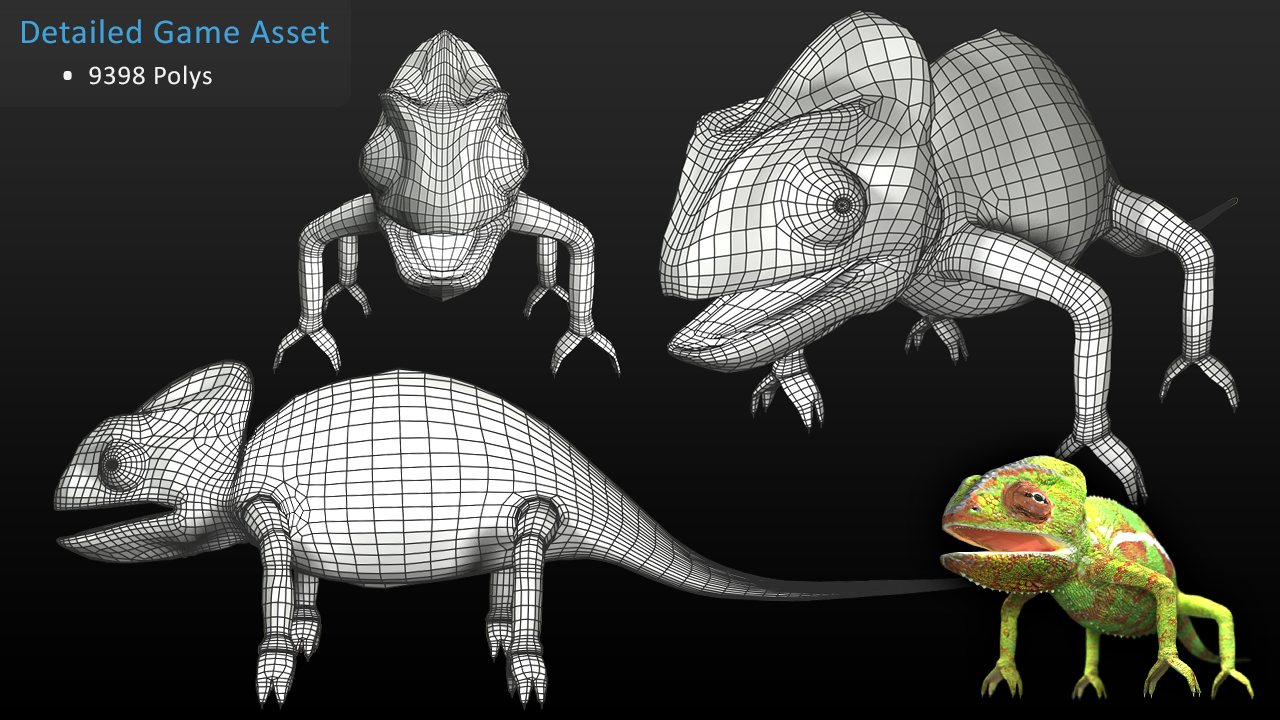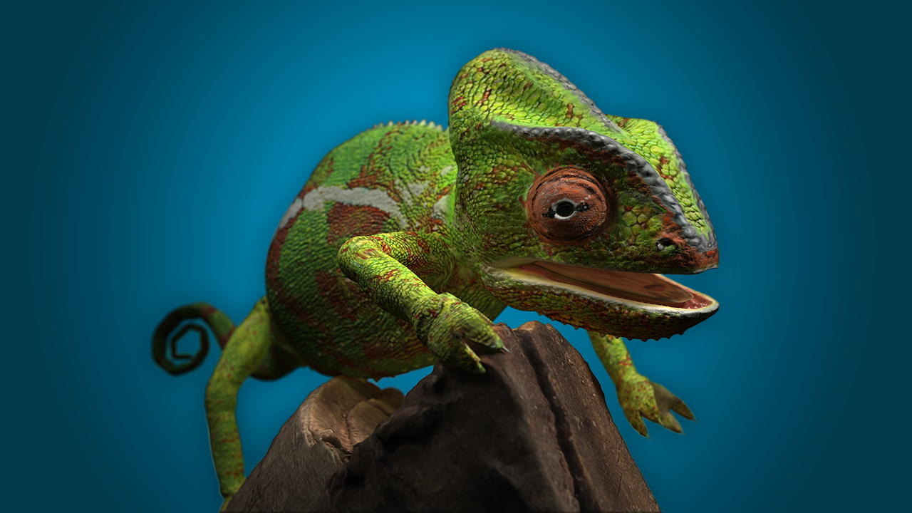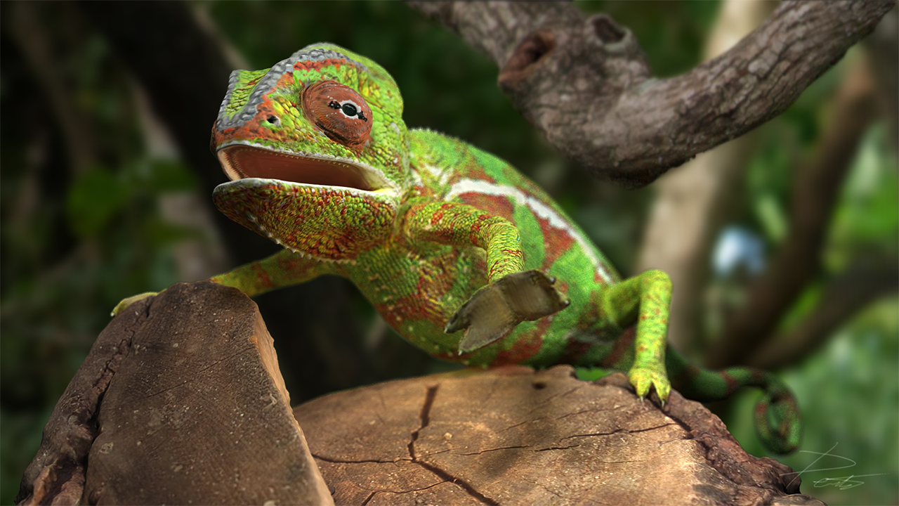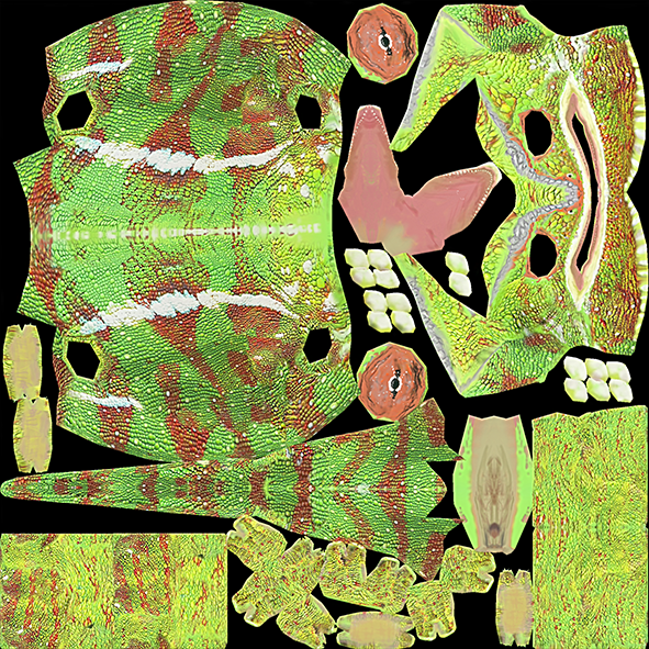 The next step was to re-topoligize the low polygon model to properly fit the new high detailed mesh. Once completed I used xNormal to bake out my texture maps and Photoshop to finalize the details in the textures and fix any baking errors. Finally I set up a skeletal rig and bound the chameleon mesh to the rig to allow for full animation or posture changes. For rendering I used Maya with the help of a proper material setup with some lights and HDR global illumination I achieved very pleasing results as seen above.