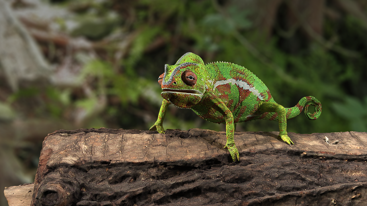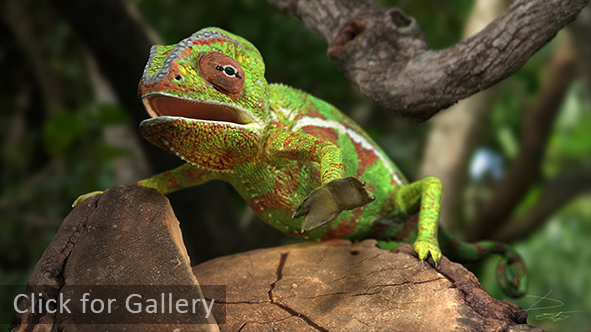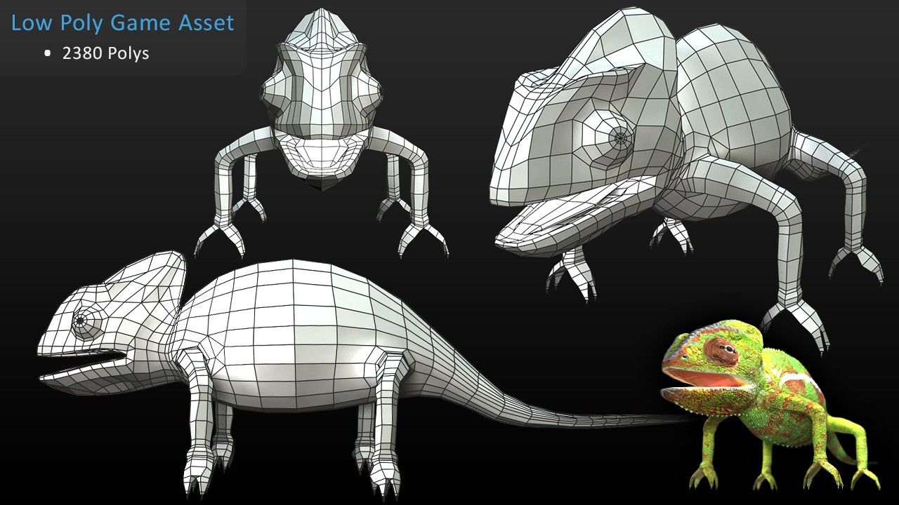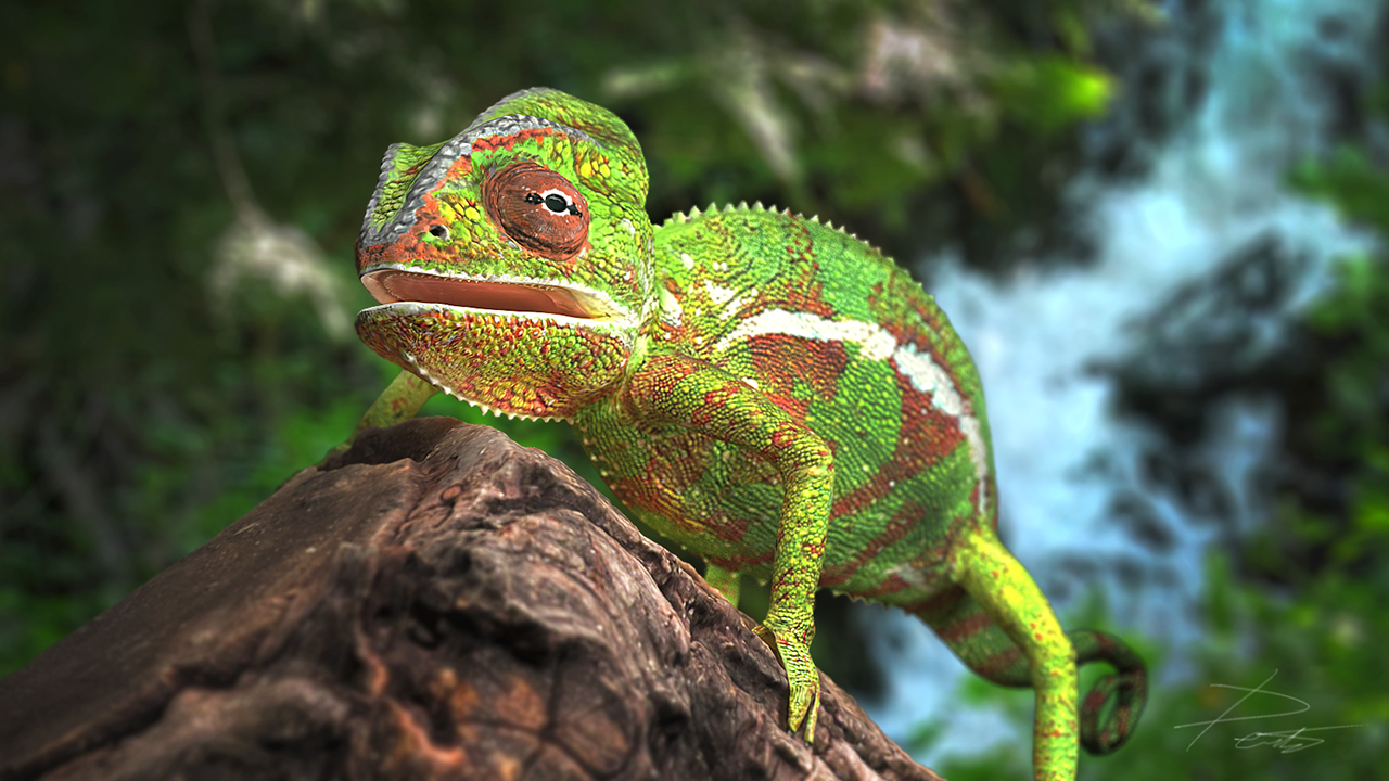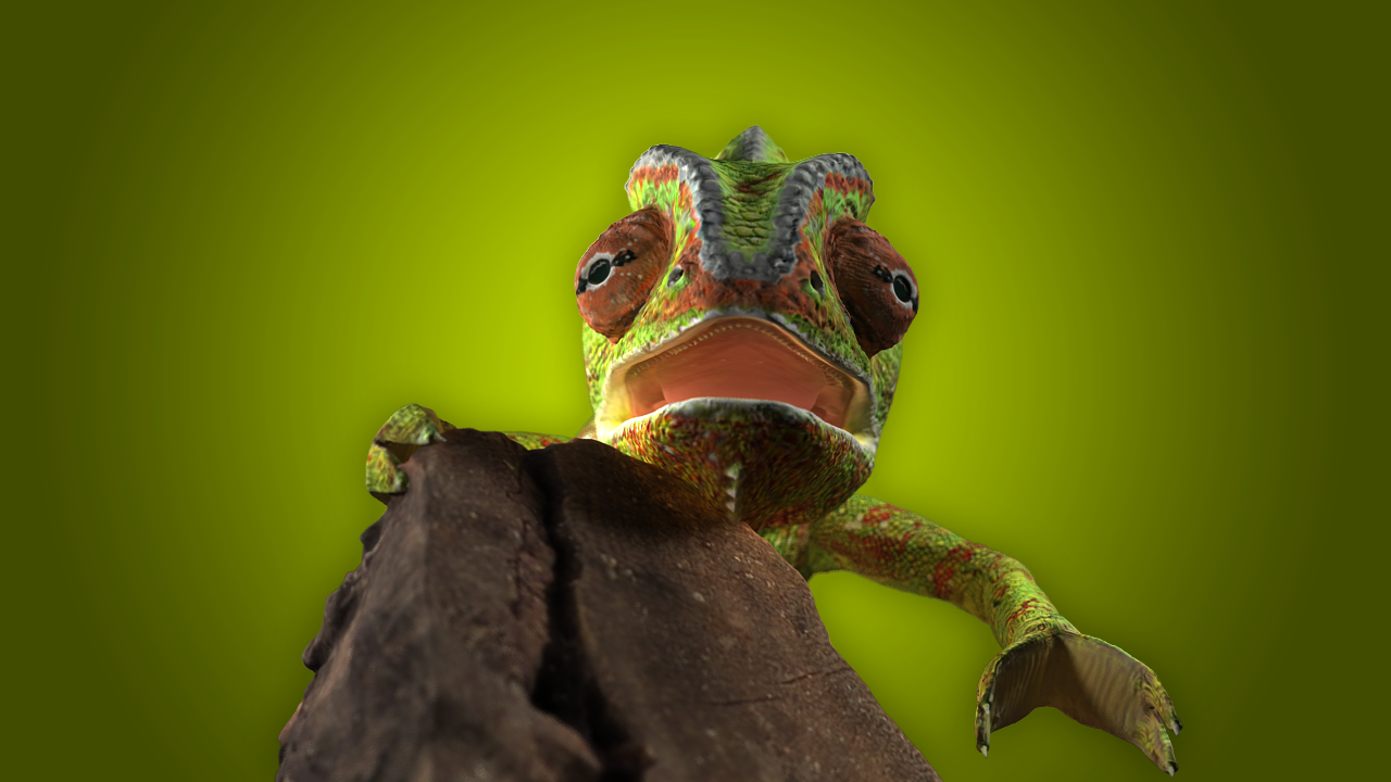 The next step was to re-topoligize the low polygon model to properly fit the new high detailed mesh. Once completed I used xNormal to bake out my texture maps and Photoshop to finalize the details in the textures and fix any baking errors. Finally I set up a skeletal rig and bound the chameleon mesh to the rig to allow for full animation or posture changes. For rendering I used Maya with the help of a proper material setup with some lights and HDR global illumination I achieved very pleasing results as seen above.